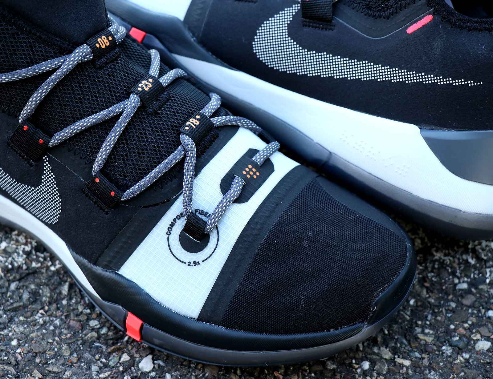 Le système de laçage quant à lui, englobe une grande partie du pied grâce notamment aux larges lanières qui servent de passants et qui font office de câbles flywire sur le milieu du pied. Un rembourrage intérieur ainsi qu’un empiècement en plastique situés au talon viennent caler et contenir efficacement le pied à l’intérieur de la chaussure pour plus de sécurité.